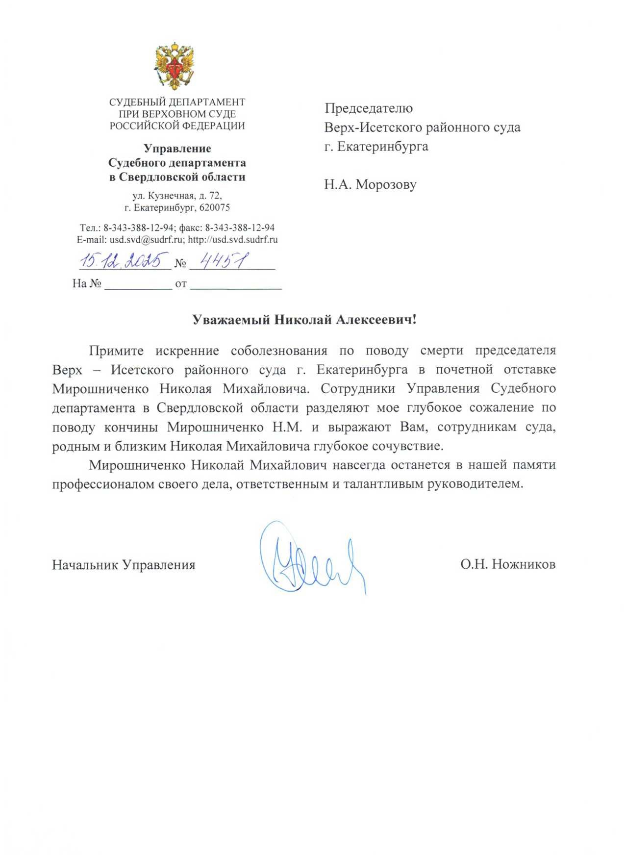 15 декабря 2025 года на 77-ом году ушел из жизни председатель Верх-Исетского районного суда г.Екатеринбурга в почетной отставке -Николай Михайлович Мирошниченко. Стаж работы Николая Михайловича в должности судьи составил 38 лет 7 месяцев. 28 лет из них он проработал председателем Каменского районного суда Свердловской области и Верх-Исетского районного суда г.Екатеринбурга. Свою профессиональную деятельность Николай Михайлович начал в 1975 году в должности судьи Каменского народного суда Свердловской области, в период с 1985 по август 1999 году занимал должность председателя этого суда. За заслуги в сфере формирования правового государства и совершенствования национального российского законодательства, защиты прав, свобод и законных интересов граждан в 1998 году Николаю Михайловичу присвоено почетное звание «Заслуженный юрист Российской Федерации». Указом Президента РФ от 25.03.2000 года № 575 Николай Михайлович был назначен на должность председателя Верх-Исетского районного суда г. Екатеринбурга, данную должность занимал на протяжении 13 лет. За время работы Николай Михайлович внес огромный личный вклад в дело осуществления правосудия, укрепления законности и правопорядка, защиты прав и законных интересов граждан. Он обладал исключительными организаторскими способностями, высоким профессионализмом, являлся квалифицированным и справедливым судьей, чутким и отзывчивым человеком, заботливым и любящим сыном, мужем и отцом. Николай Михайлович был честным, порядочным, справедливым. Жизненный путь Николая Михайловича, его отношение к людям и к делу останутся навсегда в нашей памяти. Выражаем глубокое соболезнование родным и близким Николая Михайловича и скорбим вместе с ними. Коллектив Верх-Исетского районного суда г.Екатеринбурга.